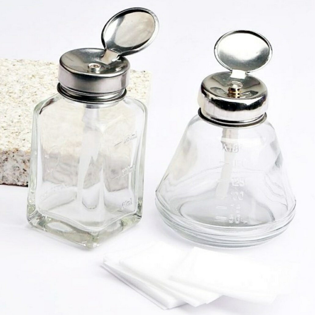 ネイル ガラスディスペンサー ディスペンサー ガラス メタルヘッド お洒落 クリアポンプ ポンプ式 ポンプディスペンサー ネイルクレンザー アセトン アルコール 除光液 安定 メモリ付き 可愛い 180ミリ扇形 長四角