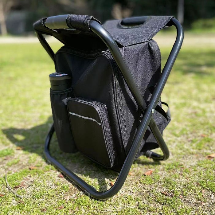 ワンサイズ(組み立て時) 横幅約34cm 奥行約28cm 高さ約41cm(座面まで) 収納時横:36cm / 縦:49cm / リュックサイズ横幅27cm/縦幅30cm/マチ16cm リュック容量18L 外ファスナー付きポケットサイズ横幅13.5cm/縦幅18cm/マチ2.5cm オープンポケットサイズ(水筒用)横幅8cm/縦幅19cm/マチ5.5cm 重量約1.5kg 耐荷重約100kg(目安) 商品詳細 座面生地素材600D ポリ生地 フレーム素材アルミ合金 生産国中国-China- 品 番RE-2203 カラー グリーン/ブラック 商品特徴 どこでも座れる、素早く使える椅子付きリュック キャンプ、釣り、運動会、登山等はアウトドアに持ち運びやすいリュックタイプのおりたたみ椅子。