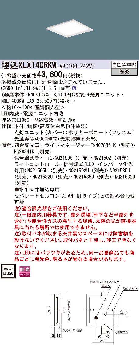【最安値挑戦中!最大25倍】【納期未定】パナソニック XLX140RKWLA9 一体型LEDベースライト 天井埋込型 スクエア光源タイプ 調光(ライコン別売) 下面開放型 白色