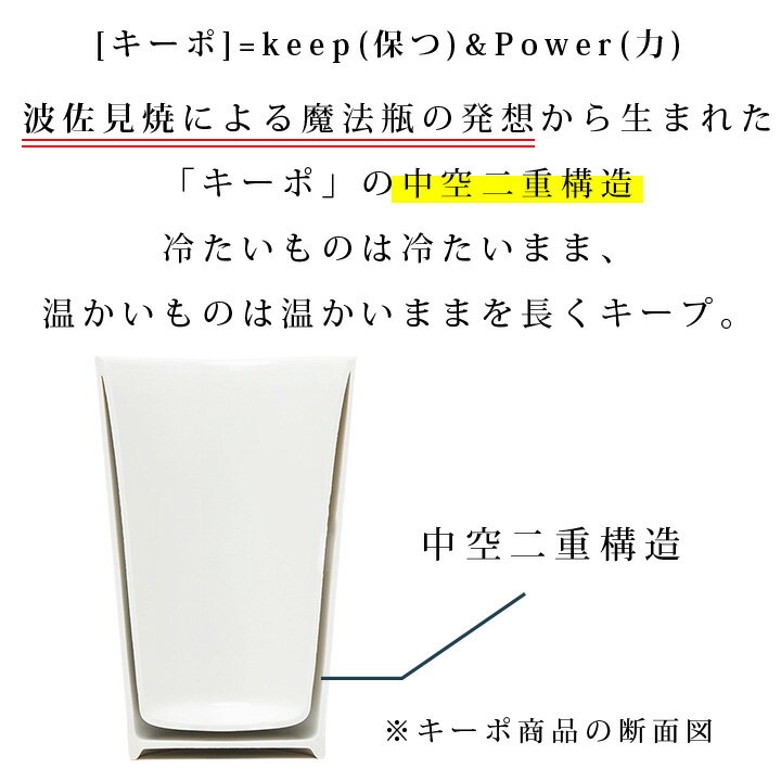 波佐見焼による中空二重構造の「キーポ」によって保温、保冷に優れ、結露がつきにくい画期的な構造に九谷焼の代表絵柄「釉裏銀彩」が銀箔の上品な光を余すことなく表現。