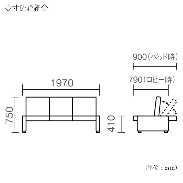 商品仕様 ■サイズ ・ロビー時/W1970×D790×H750mm SH410mm ・ベッド時/W1970×D900×H410mm ■本体・脚部/木枠、ウレタンフォーム ■フレーム/25×40角パイプ・メラミン焼付塗装(シルバー) ■カラー/グリーン・ブルー・ローズ ■重量/約49kg ■日本製 ■完成品 注意事項 ■掲載商品画像は撮影状態・PC環境などにより実物と色が異なって見える場合がございます。